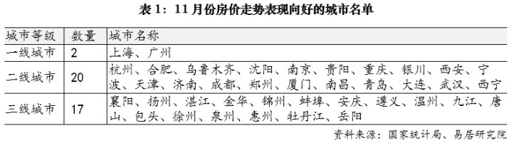 “房价走势积极向好”的定义,基于以下一种或多种特征:一是11月房价指数环比指标为正增长;二是11月房价指数同比指标为正增长;三是房价指数环比值虽下跌,但11月跌幅有所收窄,即房价指数环比曲线呈上扬态势。具体来看,结合这三个标准,全国70个城市中至少有39个城市符合。我们按城市分类进行列举。