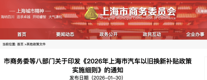 易车讯1月30日,上海市发改委、上海市财政局发布关于上海市贯彻实施2026年大规模设备更新和消费品以旧换新政策的通知。其中提出,支持汽车置换更新。